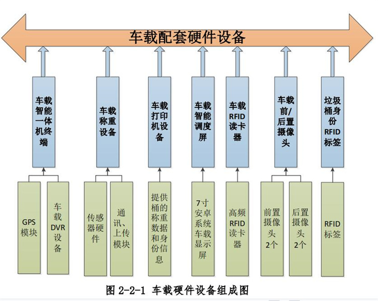 b) 有寫(xiě)入垃圾桶身份 RFID 標(biāo)簽的終端設(shè)備,可每只桶身份的相關(guān)信息參數(shù)。 3)車載智能一體機(jī)終端;