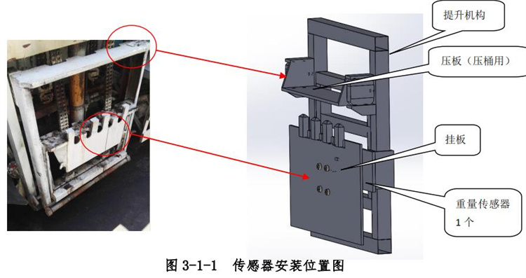 (3)側(cè)裝垃圾桶稱重過(guò)程: 垃圾車輛停車相應(yīng)位置(無(wú)需熄火),將垃圾箱推入掛板位置,啟動(dòng)液壓控制系統(tǒng),讓掛板抬升,進(jìn)行不間斷,不停頓的垃圾裝載過(guò)程,垃圾桶在豎直方向 抬升時(shí),完成重量測(cè)量,當(dāng)提升機(jī)構(gòu)返回卸載垃圾桶時(shí),對(duì)垃圾桶的進(jìn)行稱重, 此時(shí)完成稱重全過(guò)程,顯示讀數(shù)為垃圾的凈重質(zhì)量。