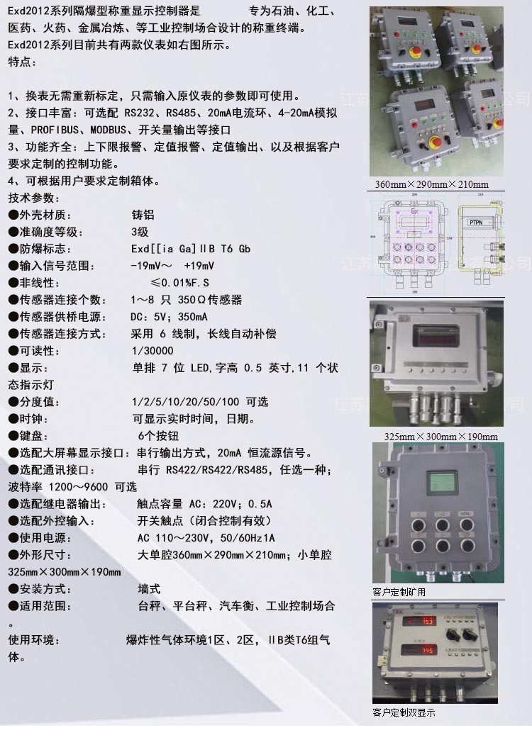 Exd2012系列隔爆型稱重顯示控制器是奕宇公司專為石油、化工、醫(yī)藥、火藥、金屬冶煉、等工業(yè)控制場(chǎng)合設(shè)計(jì)的稱重終端。Exd2012系列目前共有兩款儀表如右圖所示。