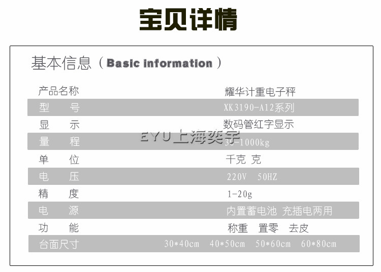 簡介:上海耀華XK3190-A12電子計重秤 工業(yè)稱重臺秤 工廠車間專用地磅秤 臺面30*40 40*50 50*60 60*80cm 稱重范圍30kg-700kg 精度1g,2g,5g,10g等。特殊需求可按需定制。