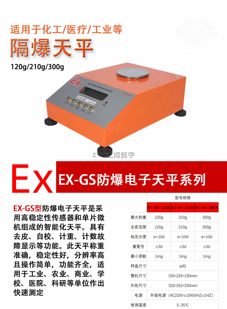 EX-GS防爆電子天平產(chǎn)品適用場(chǎng)合:化工、醫(yī)藥、倉(cāng)儲(chǔ)等有爆炸性氣體和爆炸性粉塵環(huán)境